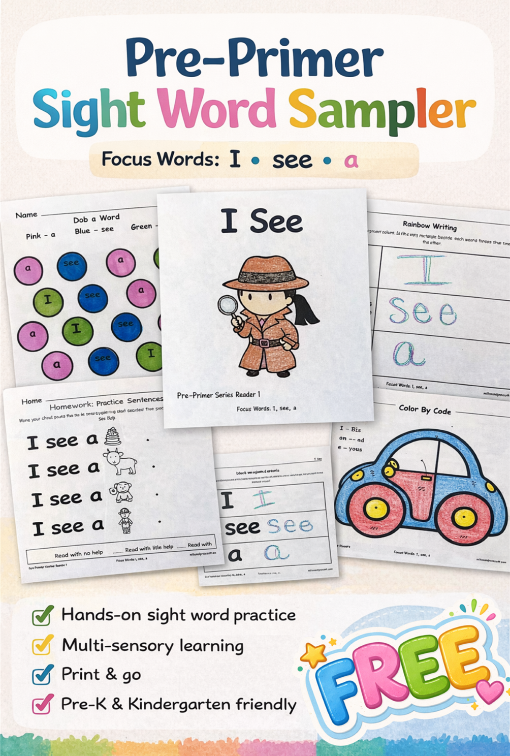Featuring the words I, see, and a, this complete activity set is perfect for Pre-K, Kindergarten, and homeschool classrooms—and gives you a true preview of our full 11-set sight word system.